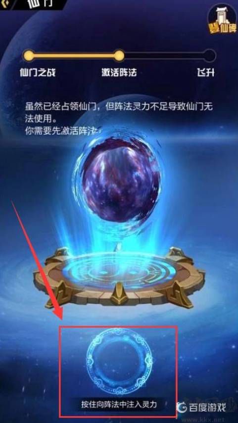 2、挑战成功后,此时会提示阵法需要激活,我们点击下方的注入灵力选项,等待注入完成。