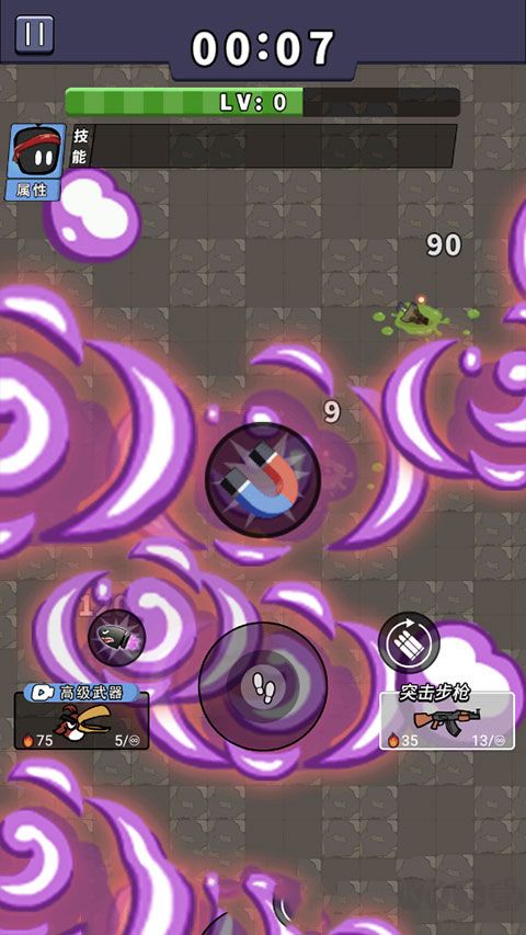 4、在场地内,将随机掉落高级武器及道具,诸如炸弹与磁铁等。一旦发现,烦请即刻点击;