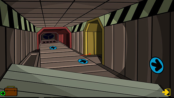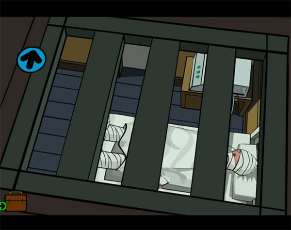 9、点右上箭头,点天花板上的通风口,进入天棚,点右侧箭头,点下面箭头,点向右的箭头,进入黄色区域,点地上的通风口2次,进入医生房间的上方。