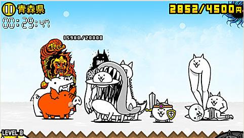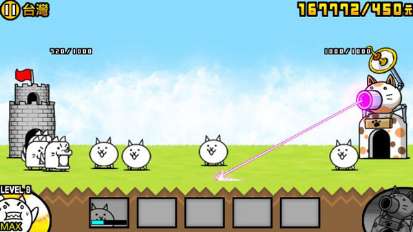 敌人城堡再度变成2WHP,不过这一关卡并不会出现一些难缠的敌人,只是有很多的以前已经见过的大型敌人等等,难点在于给予玩家的金钱累计时间比较短,不过即使如此,仍然推荐尽快派出喵UFO和喵鲸对抗再配合猫炮尽量把敌人赶出一半以上的距离,这关需要耐心,一时半会可能没有钱出高级兵种,只要喵UFO和喵鲸能和敌人胶着的话,再出喵龙和喵大帅也来得及。