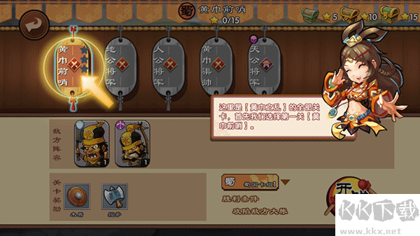 5、此处展示的是黄巾之乱的全部关卡。首先,我们选择第一关黄巾前哨。关卡下方所显示的内容,分别为该关卡将会出现的敌人、通关后可获取的物品以及通关条件。确认无误后,点击右下角的 "开战" 按钮,即可正式启动。