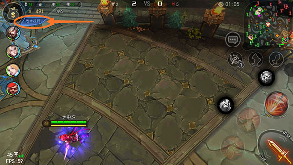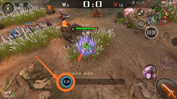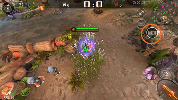 进入草丛后,会出现"回城“二字,如图,点击后,几秒钟后便可到己方泉水。