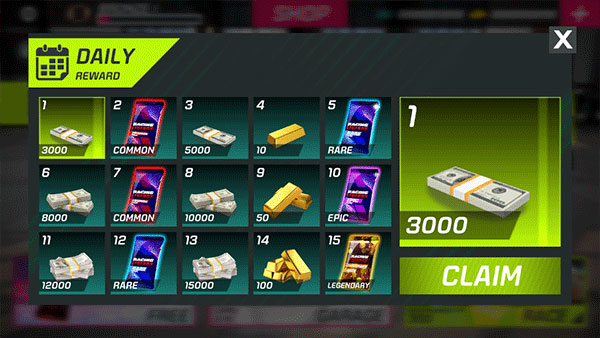 2、选择好后,就能够看到底部的各种赛事了,左上角还可以领取每日奖励,准备好酒店及RACE开始第一场较量吧。