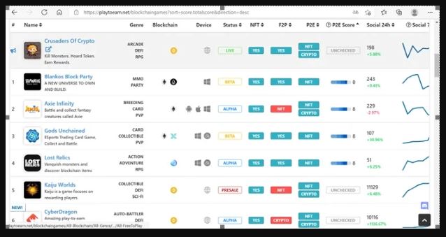 下拉可以看到排名前50的区块链游戏项目的基本信息汇总,可以根据需要在表头自定义想看的项目类型。表格中的项目数据包括游戏类型、所在公链、玩赚模式等;另外,playtoearn有两个衡量该游戏综合实力的独特指标:P2E评分(P2E Score)和7日社交趋势(Social 7d),P2E评分是playtoearn团队根据研究和测试结果得出的综合指标,包括玩家进入游戏所需成本、所获收益、游戏中的付费情况、以及游戏中的资产流动性,这一指标反映出项目本身的技术水平,而7日社交指数代表该游戏在加密社区中的受欢迎程度,反映出用户的主观感受,一硬一软两个指标可以对项目进行较为全面地展现。