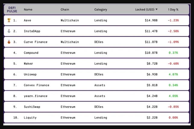 与此同时,该网站还可以实时查阅各个DeFi协议的锁仓量排名以及涨跌变化。