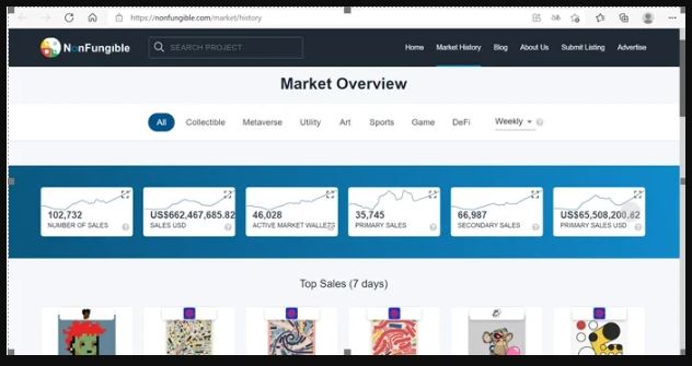 在NonFungible,可以看到整个NFT行业的总体情况以及数字收藏品、元宇宙、游戏、DeFi等7个板块的数据。以数字收藏品板块为例,在NonFungible可以查询到整个NFT数字收藏品领域的总成交量以及单个项目的具体成交量,以及NFT收藏品的“首次交易价格”“最后交易价格”“已售次数”“累计销售额”等评估一个NFT收藏品实际销售情况和热度的重要指标。另外,NonFungible首页设置了7日交易排行榜,可供用户快速筛选头部项目。