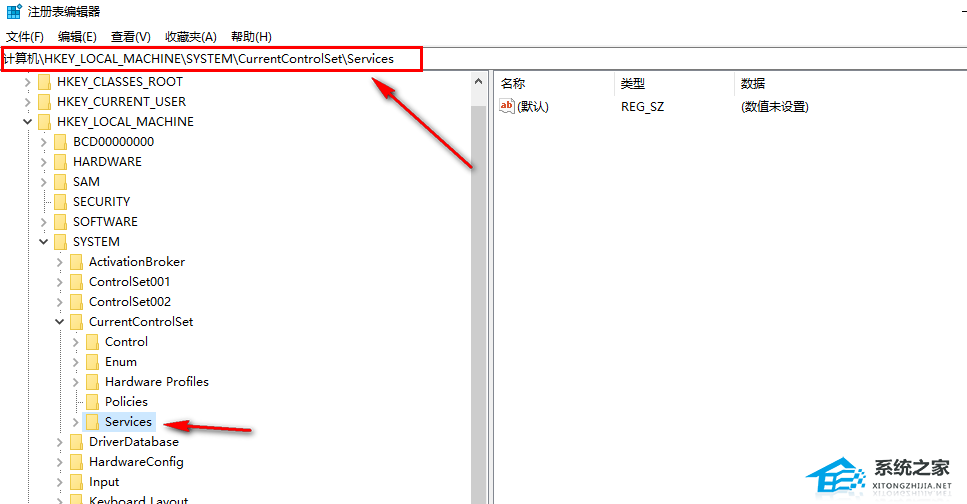 2. 进入注册表编辑器页面之后,我们在该页面中按照HKEY_LOCAL_MACHINESYSTEMCurrentControlSetServices的顺序打开文件夹。