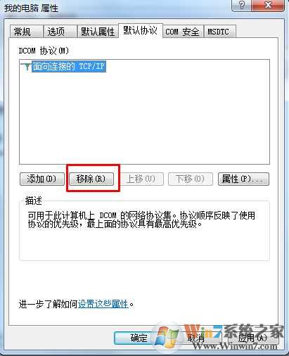 4、选择"默认协议"选项卡,选中"面向连接的TCP/IP",单击"移除"按钮