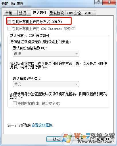 3、在出现的"我的电脑属性"对话框"默认属性"选项卡中,去掉"在此计算机上启用分布式 COM"前的勾。