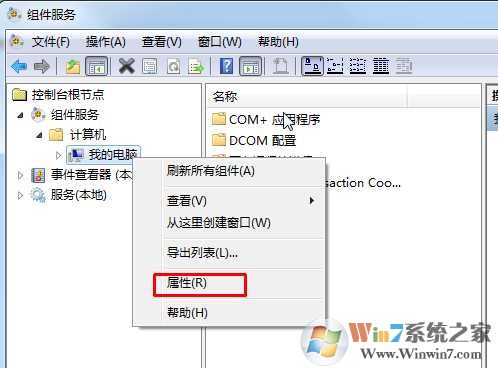 2、展开组件服务—计算机——我的电脑,右键单击"我的电脑",选择"属性"。如下图