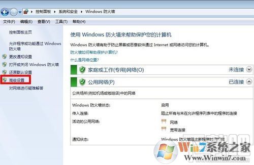 4、在打开的"Windows防火墙"对话框中点击左侧的"高级设置";