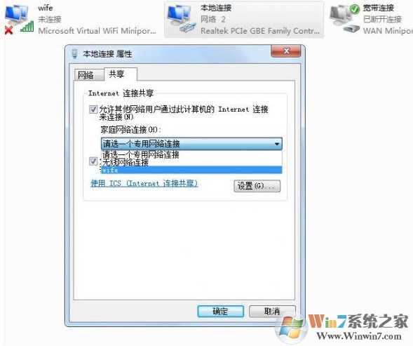 5、确定之后,可以使用的上网连接显示"共享"表示已经可以使用