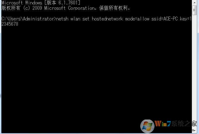 2、出现"命令提示符"输入,在界面里输入以下命令:netsh wlan set hostednetwork mode=allow ssid=ACE-PC key=12345678。回车运行