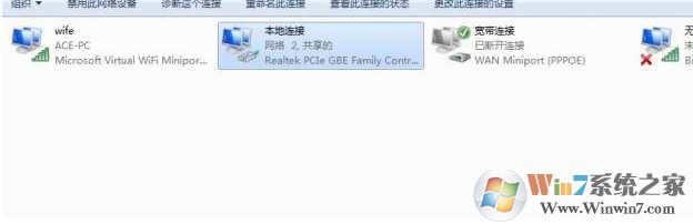 4、点击"本地连接",右键单击已经连接上网的网络连接,右击选择"属性"-"共享",按照我的截图,在第二栏的家庭网络连接选择"wifi"