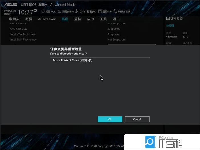 4、 最后,按键盘上的【 F10 】 键,保存 设置并退出,点击【 Ok 】 即可保存BIOS中的设置;