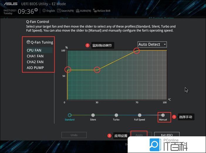 2、根据所使用的风扇,选择DC Mode或PWM Mode,然后选择【 Manual (手动) 】,调节到合适的速度点,最后点击【 Appyly (应用) 】设置; Q-Fan Tuning:选择要调速的风扇 AUTO Detect:切换风扇模式【DC Mode(3pin风扇);PWM Mode(4pin风扇)】