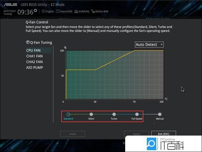 3、如果不想手动调节速度点,也可以用应用下方的预设点,有【 Standard (标准),slient (静音),Turbo (涡轮加速),Full Speed (全速) 】可选;