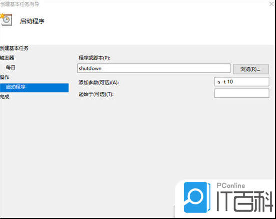 7、 程序中填"shutdown"命令,参数设置成"-s -t 10",意思是23点后的10秒执行关机任务;