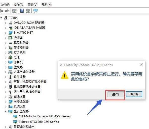6、系统提示设备将停止运行,点击是按钮,集成显卡被禁用了,屏幕会瞬间闪烁一下,一般此时会自动启用独立显卡,不行的话手动启动,往下看如下图所示:
