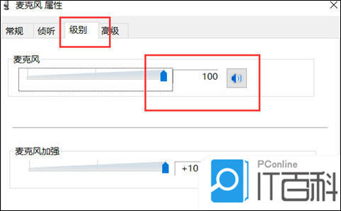 4. 点击切换至"级别"的选项卡调整麦克风音量至最大,如果麦克风声音不够大,我们还可以设置麦克风加强;