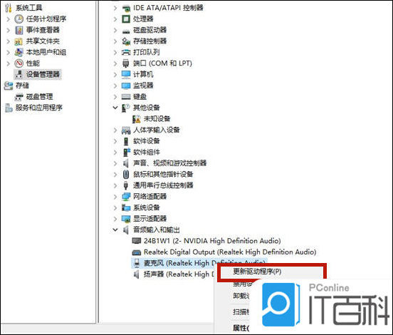 2. 设备管理器窗口,在音频输入和输出下,右键点击"麦克风",在打开的菜单项中,选择"更新驱动程序"。