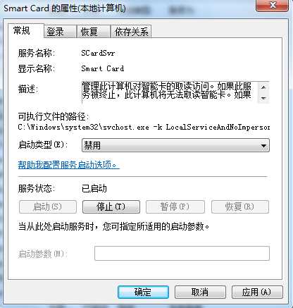 2、在服务中找到Smart card 服务,然后双击打开设置为禁用,并停止该服务就可以了!