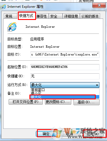 3、选择到快捷方式,在运行方式中选择"最大化",如下图所示。