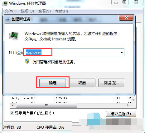 3、结束后,再点击"文件"——"新建任务(运行)"——输入"explorer.exe"回车;