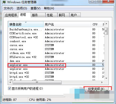 2、切换到"进程"找到 Explorer.exe 选择后"结束"进程;