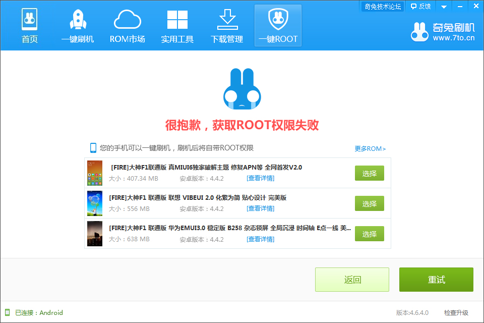 5.若您的华为mate10 pro(BLA-AL00)手机获取ROOT权限失败,可选择一键刷机,刷机后将自带ROOT权限。