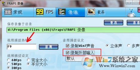 3.、打开fraps,切换到录像,默认的录像快捷键是F9,如果要修改的话,点击"禁用",然后按键盘上要设置的热键就可以更改了;录制游戏的时候,要加入解说,点击勾选"录制外部输入",设备为电脑默认的录音设备,如图: