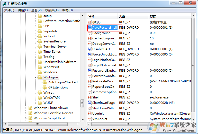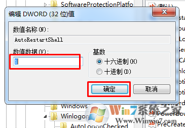 5、将AutoRestartShell数值修改为1;如果没有我们就新建一个AutoRestartShell将数值设定为1即可