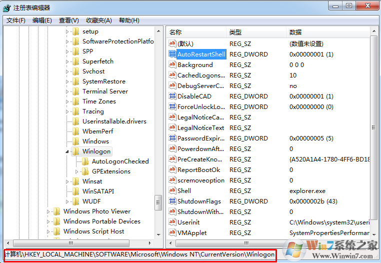 3、依次展开左侧菜单:HKEY_LOCAL_MACHINE\SOFTWARE\Microsoft\Windows NT\CurrentVersion\Winlogon\AutoLogonChecked;