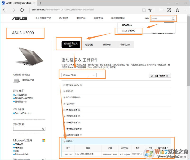 1、访问华硕官网下载某一机型或者主板Windows7系统下的的USB3.0驱动,我们以U3000为例: