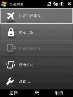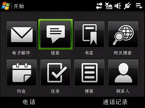 多普达Touch Pro在推开滑盖之后屏幕会自动横屏显示,并且还会弹出一个具备电子邮件、信息、书签、网页搜索、约会、任务、便签、联系人等8个快捷方式的窗口,方便用户选择启用所需要利用到Qwerty键盘进行快速文字输入的功能。