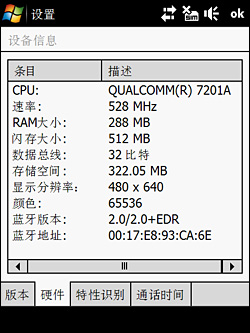 多普达Touch Pro的机身配备了一颗高通的MSM7201A高频处理器,最高频率高达528Mhz,与Diamond的处理器为同一产品,性能非常的不错。但是在内存规格方面 Touch Pro比Diamond提升了一个等级,机身闪存容量为512M(可用322M),而运行内存更是提升到了288M(可用200M),搭配上超强的CPU,整机的运行速度再度得到了提升,响应速度要比diamond快不少。