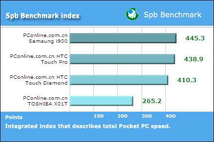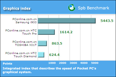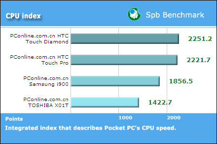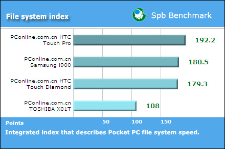 在对于多普达Touch Pro整体性能测试方面,我们采用了PPC上权威的测试软件Spb benchmark进行性能测试,在与Touch Diamond以及近期热卖的三星i908的比较的图表中大家可以看到三星i728这款机器的整体性能处于一个怎样的位置,实际的应用表现会是怎样,与其他机型对比在性能方面是否有优势。 从Spb benchmark的测试成绩可以看到,多普达Touch Pro在528MHz的CPU情况下除了在显示性能方面因为超高分辨率败给三星i900之外,其他各项的性能表现都非常的不错,相比Touch Diamond来说有了很大的提升。