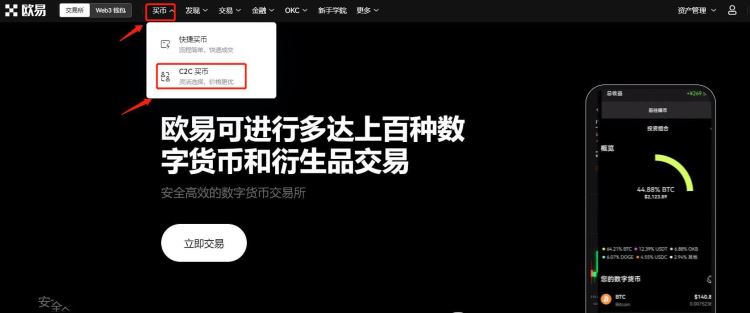 3.注册以及认证完成之后即可进行交易,在首页点击【买币】进入【C2C买币】页面