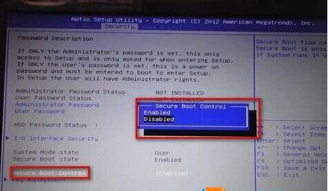 2、我们点击SETUP进入到BIOS,然后左右键定位到Security页面,找到Secure BOOT Control,回车将Enabled改为Disabled,如下图;