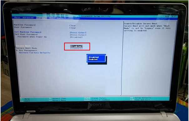 3,接下来就进入到了索尼笔记本的BIOS主界面,进入到BIOS操作界面后.在键盘上面选择其方向右键在Security(中文意思安全,安全的)选项下找到Secure Boot,将Enabled改为Disabled,如所图所示:www.xitonghe.com