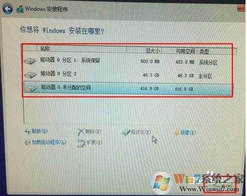 3、这时,主分区已经分配好48G的空间,还有400多G没有分区,大家可以继续分区,或是安装好Win10后再分区;Win10系统下载 www.winwin7.com/Win10/