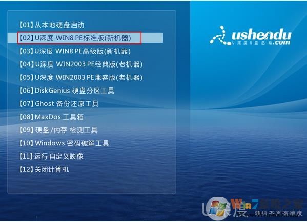 1、将制作好的u盘启动盘连接到电脑usb接口,重启电脑等待出现开机界面瞬间按下启动快捷键,系统会进入到启动项选择窗口,然后选择u盘启动后,系统进入至u深度主菜单,选择【02】u深度Win8PE标准版(新机器),按下回车键确认,如图所示: