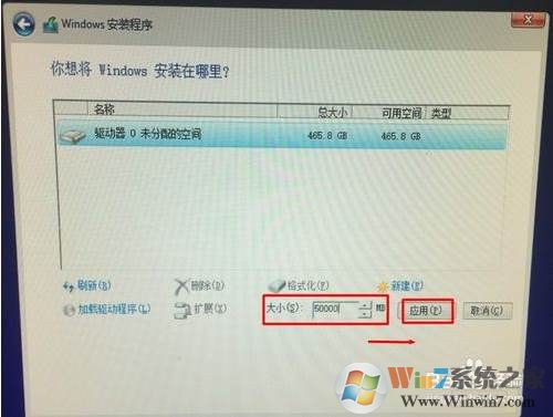 2、然后我们要创建第一个分区,也就是大家安装系统的分区,输入分区的大小 1000M=1G 然后应用;