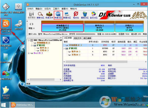 进入win8pe桌面后,双击"DiskGenius分区工具",在diskgenius分区工具主菜单栏上点击"快速分区"如图所示: