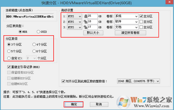 这样子就一键搞定了分区,不过需要注意的是,如果你之前的分区为GPT格式,那么需要在删除所有分区后,转换为MBR分区格式,然后再使用快速分区。