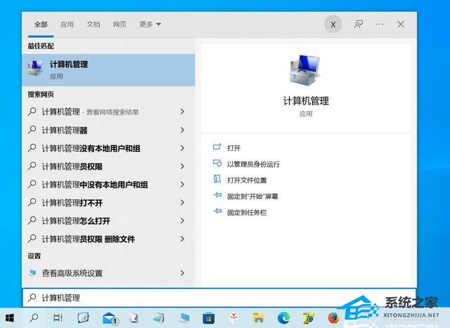 在Windows搜索框中输入“计算机管理”,可以直接单击“打开”命令打开计算机管理控制台,还可以通过单击以管理员身份运行来选择以管理员权限运行它。