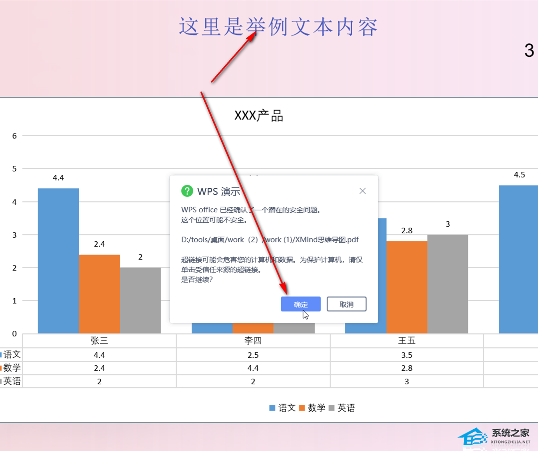第三步:后续进入放映视图后,点击一下设置了超链接的元素,在弹出的提示窗口中点击确定就可以打开文件了;