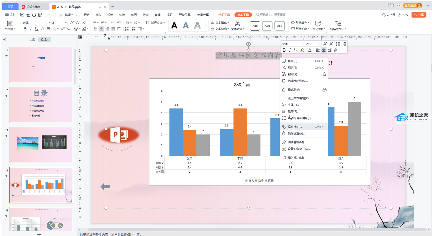 第一步:双击打开WPS演示文稿,选中文字,图片,图形等元素后,按Ctrl+K键,或者右键点击一下后选择“超链接”;