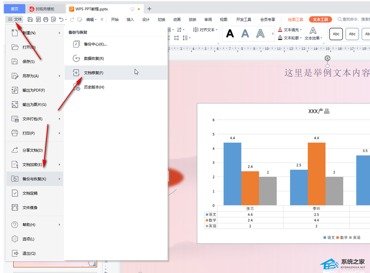 第四步:如果如果正常进行打开,可以在“文件”选项卡中点击“备份与恢复”——“文档修复”;