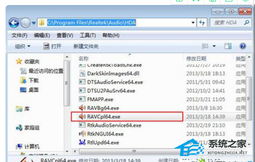 2、如果控制面板没有管理器选项,则进入C:Program FilesRealtekAudioHAD目录,双击打开RAVCpl64.exe,并在Realtek高清晰音频管理器右上角,点击黄色文件夹图标,它是插孔设置图标。